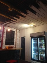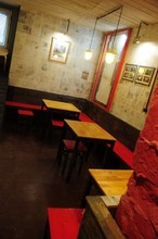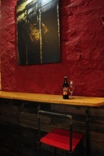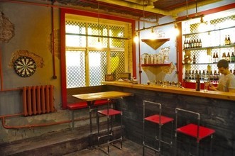Бар «Спящая собака» расположился в подвальном помещении. Интерьер облагородили, местами оставили оригинальные кирпичные стены и добавили ярких красных, и желтых акцентов.